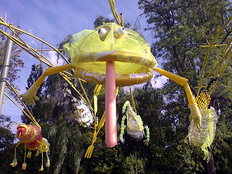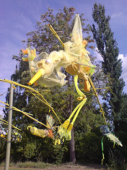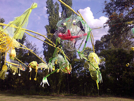The supporting 'hangers' are constructed from the bamboo giant reed weed that overgrows the banks of the Pages. The sculptures are made from recycled yellow materials.